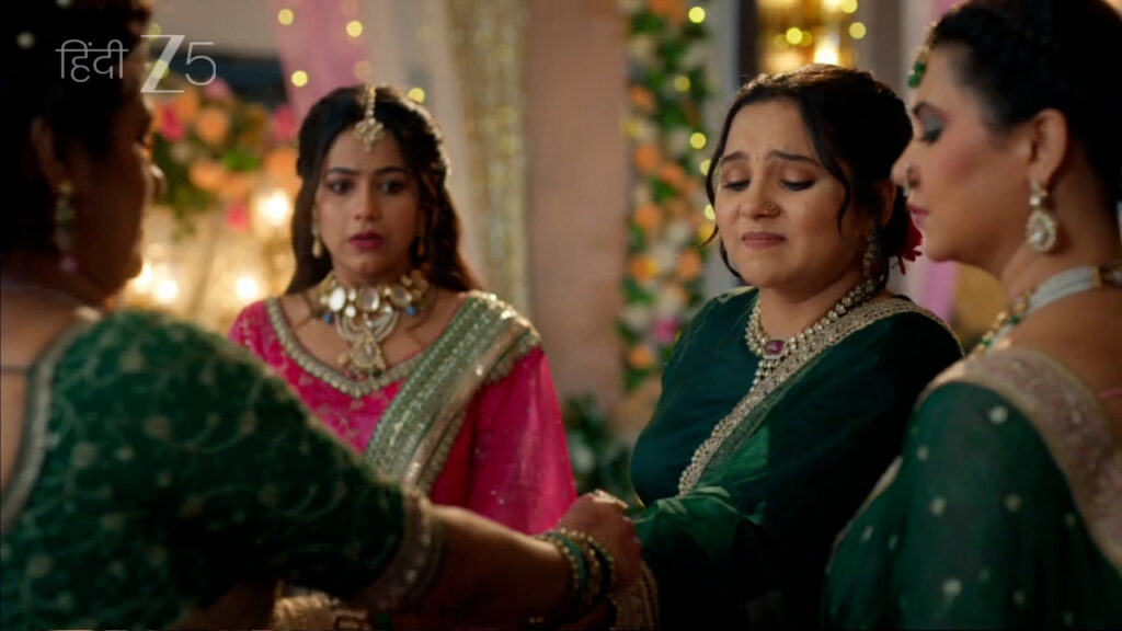 Chandrika’s words spark chaos. Sarika Chachi forcibly grabs Vasudha’s hand and begins to rub away the mehendi. There’s tension in the air as the family watches. But no matter how hard Sarika and others try, the mehendi remains firmly on Vasudha’s hand — it refuses to go away.
